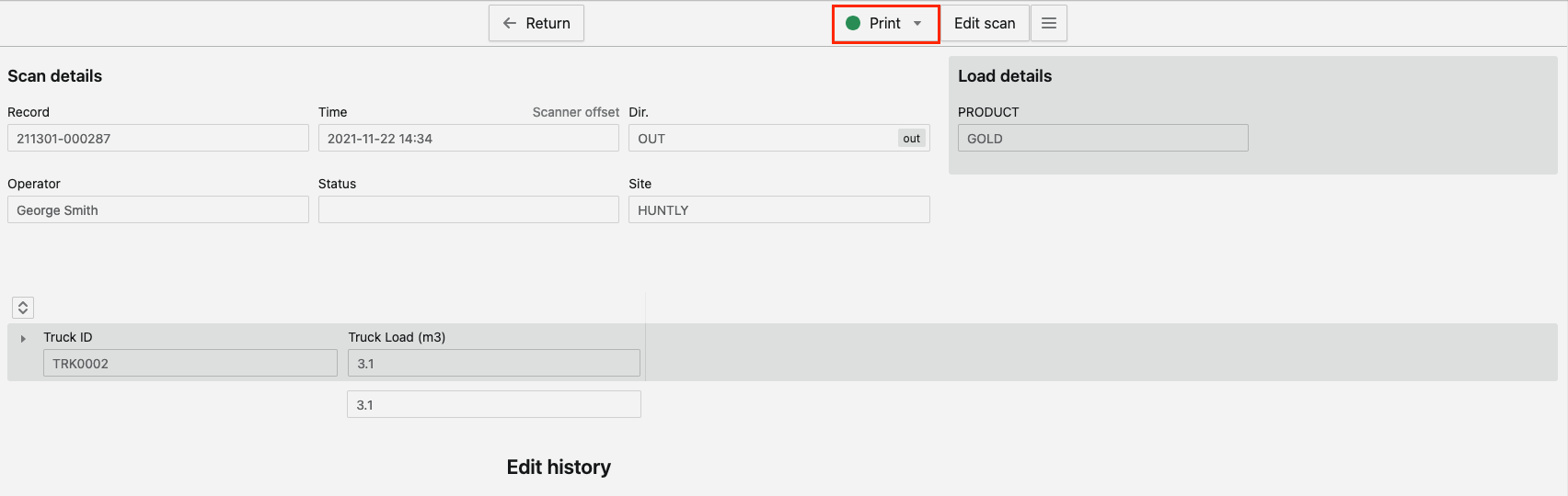 Para imprimir un único registro de escaneado en PDF, selecciona PDF cuando hagas clic en el botón Imprimir de la página de detalles del escaneado de un registro de medición.